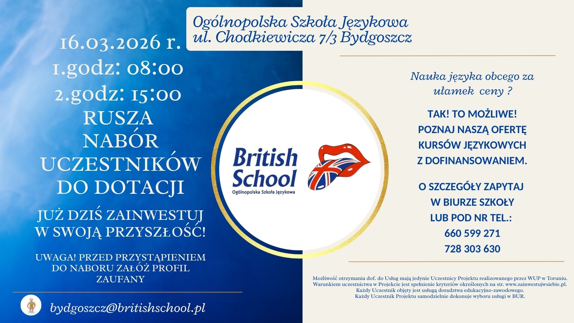 Szczegóły pod nr tel.: 660 599 271 / Sekretariat British School ul. Chodkiewicza 7/3, Bydgoszcz