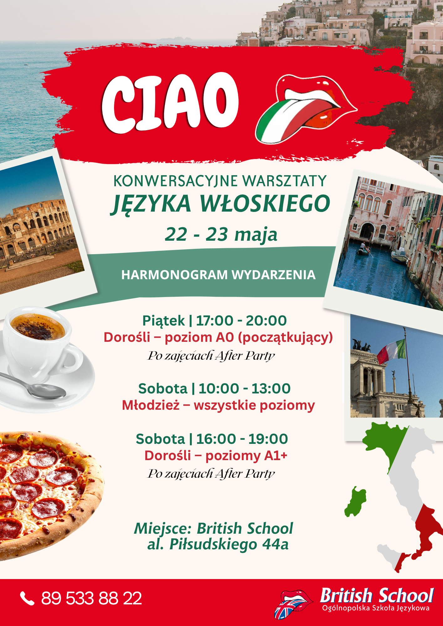Zapraszamy na wyjątkowe, weekendowe warsztaty języka włoskiego, które odbędą się 22–23 maja. To doskonała okazja, aby zanurzyć się w języku, przełamać barierę mówienia i poczuć prawdziwy włoski klimat w kameralnej, przyjaznej atmosferze.